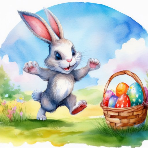Watercolor painted cute bunny, elegantly adorned with delicate floral elements and beautifully decorated eggs.