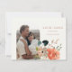 This gorgeous wedding save the date flat card features a lovely creamy ivory background, both back and front. A contemporary set of fonts in a rich ochre, couple photo in arch form and voluptious watercolor blooms sets a joyful and elegant tone.
