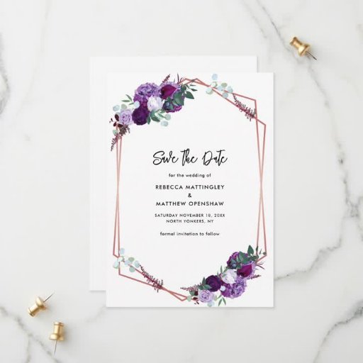 Our purple floral geometric collection is perfect for creating an announcement for your wedding. Featuring a modern black calligraphy, with rose gold geometric frame on white background, this is perfect for a Save the Date announcement. TIP: RSVP cards, wedding invitation, Bridal Shower, and much more are available in this wedding suite curated for your convenience