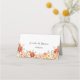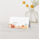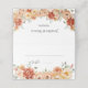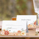 Elegant floral folded place cards feature watercolor flowers in shades of orange, red, yellow, and peach, accompanied by lush green leaves, forming a stunning bouquet. Perfect for weddings or other banquets.
