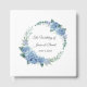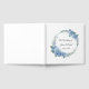 This wedding guest book is shown in a lovely watercolor floral wreath print of blue hydrangeas; text is shown in a slate grey colour.