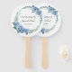 This wedding paddle fan is shown in a lovely watercolor floral wreath print of blue hydrangeas, text is shown in a slate grey colour.