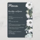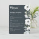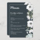 Floral wedding menu with white flowers and customisable text printed on dark background