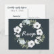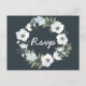Floral wedding RSVP postcards with white wreath and customisable text printed on dark background