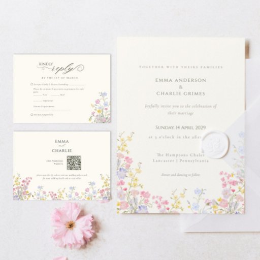 Celebrate a romantic spring or summer wedding with this Wildflower Meadow Botanical Wedding Invitation, designed with soft watercolor florals and pastel garden blooms. Delicate pink, yellow, lilac, and blue wildflowers frame your wording beautifully, creating a fresh and elegant countryside feel.
