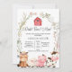 Cute farm animals themed baby shower invitation featuring four watercolor farm animals, a red barn and a lovely wildflower floral wreath. The design is rustic in style and features a wood image on the back.