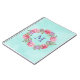 A custom monogrammed notebook. The design is a beautiful botanical themed illustration with a circular wreath of pretty watercolor flowers in pink and purple with green leaves in between. The floral design is made up of pink peonies and purple anemones. The background is a soft mint green watercolor texture.