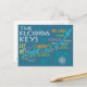 The Florida Keys Map original illustration with the island names in colourful retro illustrated map style. From Key West to Key Largo and everything in between, this string of islands has a lot of fun and interesting names. An outline map of the geography of the islands is surrounded by the names in tropical colours and fun typography, and silhouettes of a pelican, dolphin, sailfish, palm trees, sailboat, stingray, and lobster to represent some of the natural flora and fauna of the Keys.