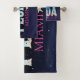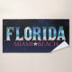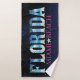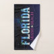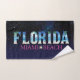 This trendy, elegant summer Bath Towel Set of 2023, A design that contains the word Florida, with the effect of the sea, the sun, and trees, and is chraacterised by the blue colours of the sea and yellow sand, and underneath it is the word Miami Beach in fuchsia