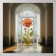 This imaginative artwork presents a captivating fusion of classical architecture and surreal nature. Inside an ornate, grand hall with high ceilings and arched windows, two elegant glass doors open to reveal a towering, oversized flower in full bloom. The vibrant pink and peach petals contrast with the refined, classical interior, symbolising the power of nature breaking free from confinement. The surreal juxtaposition between the natural and architectural elements evokes a dreamlike atmosphere, inviting viewers to reflect on the balance between human creations and the natural world.