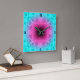 Digital art design in an abstract symmetrical pattern of shades of light blue, pink and purple that resembles looking down into the centre of a flower. Custom-designed blue numbers at hours 3, 6, 9, 12.