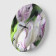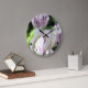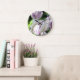 This is a picture of beautiful lilac and white flowers, printed on a wall clock with chic and charter numbers.