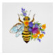Artistically drawn, flower, honey bee with contrasting colors, yellow, bright, blooming california poppy and blue wild plants on white background.