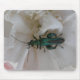 This mousepad features a photograph of a bluish green coloured British species of Flower Beetle sitting on a white Carnation flower. The photo was taken using macro photography to show the detail and colour of this beautiful beetle species.