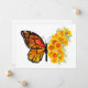 Orange, detailed monarch butterfly with wing decorated with yellow, vibrant California poppy on white background.