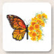 Orange, detailed monarch butterfly with wing decorated with yellow, vibrant California poppy on white background.