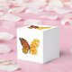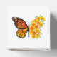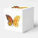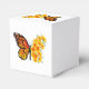 Orange, detailed monarch butterfly with wing decorated with yellow, vibrant California poppy on white background.