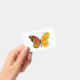 Orange, detailed monarch butterfly with wing decorated with yellow, vibrant California poppy on white background.