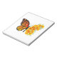 Orange, detailed monarch butterfly with wing decorated with yellow, vibrant California poppy on white background.