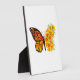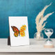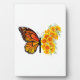 Orange, detailed monarch butterfly with wing decorated with yellow, vibrant California poppy on white background.