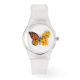 Orange, detailed monarch butterfly with wing decorated with yellow, vibrant California poppy on white background.