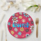 Set of eight 9” paper plates with the 60s catchword “Groovy!” in ombre blue and pink 60s-style lettering on a vintage 1960s image of whimsical yellow, blue, orange and purple flowers on red. See matching candy jar, espresso cup, flask, pitcher, shot glass, teapot and coasters. See the entire Psychedelic 60s Plate collection in the FOOD/BEV | Dishes section.