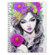 A black and white line drawing of a beautiful girl covered with colourful flowers