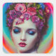 A beautiful ai-generated art nouveau portrait of a woman in a hat made of flowers, surrounded by a rainbow aura. It would be a beautiful addition to a boudoir or a girl's bedroom.
