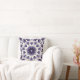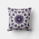 Flower mandala pillow with a kaleidoscopic pattern created from a watercolor and ink drawing of an abstract lotus flower in blue, violet and black.