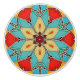A neutral coloured flower with red decoration, within a larger floral motif of turquoise. The whole design is made up of shaped glass tiles, like a mosaic, with an enamel style opaque glass finish.