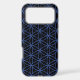 The flower of life symbol in a repeat pattern in blue detail on a black background.