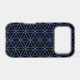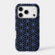 The flower of life symbol in a repeat pattern in blue detail on a black background.