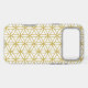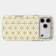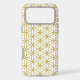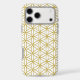 The flower of life symbol in a repeat pattern in gold detail on a white background.