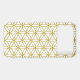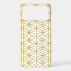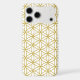 The flower of life symbol in a repeat pattern in gold detail on a white background.