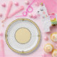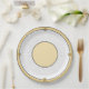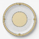 The cheerful, Art Deco inspired, original digital painting by Leslie Sigal Javorek adorning this paper plate features a stylised flower of pale grey, sunflower yellow, plus accents of cherry red & teal outlined in black that is set against a background of solid goldenrod, black & white stripes.
