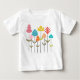 This baby t-shirt has a mid-century modern design of flower made from squares, ovals, and diamonds that have been manipulated to form flowers.