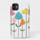 This phone case has a mid-century modern design of flower made from squares, ovals, and diamonds that have been manipulated to form flowers.