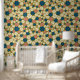Flower Pattern - Blue, Olive Green, Pink and Cream Wallpaper