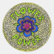 A sticker with a crazy psychedelic daisy and the words flower power.