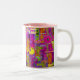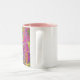 Drink coffee or tea? Try this cute and colourful two tone Flower Power mug! This mug depicts a picture of my flower power mixed media collage on one side, and is coloured pink on the inside. It features a colourful hand drawn flower and a cute yellow bird with long black and white striped legs. These characters sit atop a background of various colourful decorative papers and paints in pink, purple and orange. As a final touch glitter flowers and different colour butterflies complete the piece.