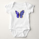 Jewellery, blue, sapphire, sparkling flower butterfly with wing decorated with blue, precious flowers with gold leaves on white background.