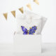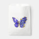 Jewellery, blue, sapphire, sparkling flower butterfly with wing decorated with blue, precious flowers with gold leaves on white background.