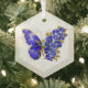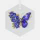 Jewellery, blue, sapphire, sparkling flower butterfly with wing decorated with blue, precious flowers with gold leaves on white background.