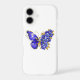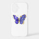 Jewellery, blue, sapphire, sparkling flower butterfly with wing decorated with blue, precious flowers with gold leaves on white background.