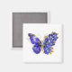 Jewellery, blue, sapphire, sparkling flower butterfly with wing decorated with blue, precious flowers with gold leaves on white background.