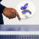Jewellery, blue, sapphire, sparkling flower butterfly with wing decorated with blue, precious flowers with gold leaves on white background.