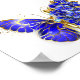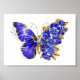 Jewellery, blue, sapphire, sparkling flower butterfly with wing decorated with blue, precious flowers with gold leaves on white background.