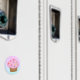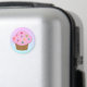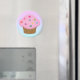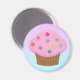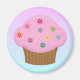 This magnet features a pink cupcake with lots of flower sprinkles on a pink and blue gradient background.