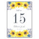 Country chic table number cards feature clusters of yellow watercolor sunflowers, green leaves and tiny navy blue buds, framing your table number in smoky blue-grey. Personalise with your names and wedding date, or name each table for an extra personal touch. Design repeats on reverse side. Coordinates with our Flowerfields rustic floral wedding invitation suite.