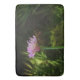 The original photograph by ZoeSPEAK on this large Bath Mat is a closeup of a chives flower blooming against a soft focus background of saw palmetto. Sunlight is just entering the garden, highlighting the spring green of the palmetto and the lavender of the flower.